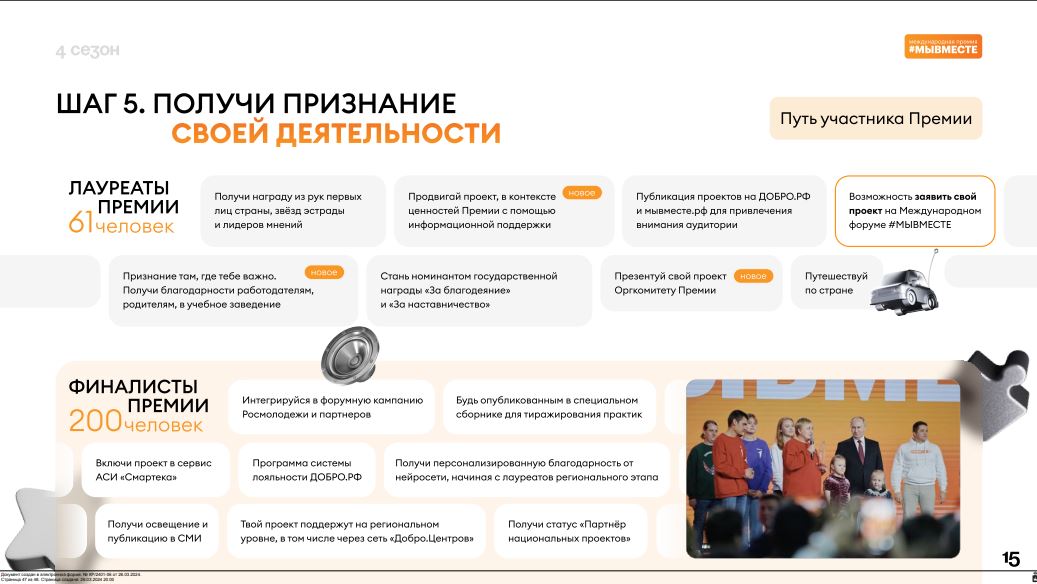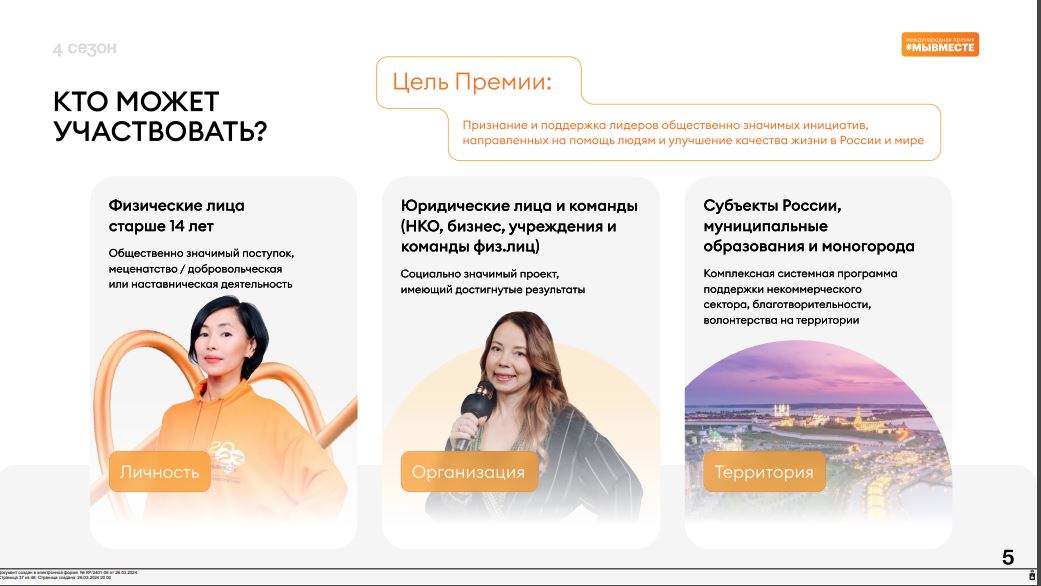 НовостиМеждународная Премия #МЫВМЕСТЕОсновной целью Премии является признание и поддержка лидеров общественно значимых инициатив, направленных на помощь людям и улучшение качества жизни в России и мире. Премия показывает вклад общества в достижение национальных целей развития России до 2030 года. Дата новости: 10.04.2024 |